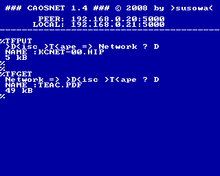 der TCPIP-Treiber kann ohne Anpassung auch unter CAOS verwendet werden aber für alle Systemaus- und -eingaben war in CAOSNET.KCC nun noch einige Handarbeit notwendig, um die CP/M-spezifischen Programmteile zu ersetzen, Ende August funktionierte schliesslich das Netzwerk auch unter CAOS und mit dem TFTP-Client von CAOSNET 1.4 konnte ich endlich ohne Umwege auch unter CAOS Daten im Heimnetzwerk transportieren: