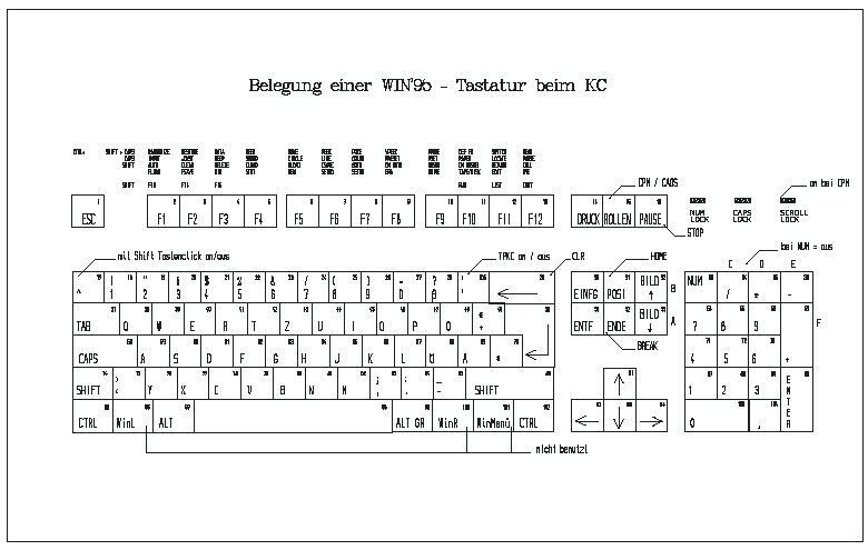 Alle diese Nachteile bestehen mit dem hier aufgezeigten Lösungsvorschlag nicht mehr. Denn PC-Tastaturen sind ja überall billig zu bekommen, und die Tastaturfunktionen des KC's sind, bis auf 3 Ausnahmen (Tastenclick, TPKC-Belegung, Umschaltung CP/M - CAOS), der Beschriftung einer deutschen PC-Standard-Tastatur zumindest logisch zugeordnet.