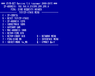 Eine manuelle Konfiguration der Netzwerkparameter wird ebenfalls in diesem Menü vorgenommen und umfasst mindestens die Eingabe gültiger Parameter für die IP-Adresse und Subnetzmaske. Anschliessend sollte der CAOS- bzw. CP/M-Rechner im Netzwerk auf PING-Kommandos antworten (siehe Artikel Netzwerk-Konfiguration).