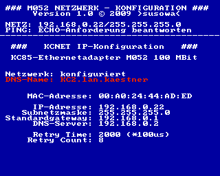 Für den DNS-Test im eigenen Netzwerk muss der KC per DHCP konfiguriert werden, wobei dort auch der gewünschte DNS-Name eingegeben wird. Wenn das erfolgt ist, ruft man unter CAOS den Befehl %INFO in der Netzwerkkonfiguration auf, bzw. unter CP/M das Programm NCFG.COM ohne Parameter. Wenn die in den folgenden beiden Screenshots rot markierte Zeile ausgegeben wird, funktioniert DNS. Meldet die im Hintergrund durchgeführte DNS-Abfrage einen Fehler, wird diese Zeile weggelassen, dann funktioniert DNS nicht.