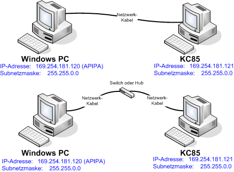 Im oberen Beispiel werden 2 Rechner mit einem Netzwerkkabel direkt verbunden, was so nur mit 2 Teilnehmern möglich ist. Das stellt die Minimalvariante eines Ethernet-Netzwerkes dar, welche ohne zusätzliche Hardware aufgebaut werden kann. Typische Anwendung wäre beispielsweise der direkte Anschluss eines Notebooks an den KC85 für den Austausch von Daten. Die Ausführung des Kabels ist egal, da das KCNET-Interface eine direkte bzw. gekreuzte Verbindung von Tx und Rx automatisch erkennt.
