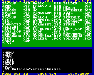 Der wichtigste Programmteil dürfte nach wie vor das Terminal sein, welches durch %VINCULUM aus dem CAOS-Menü gestartet wird. Das Systemdatum wird automatisch vom GIDE-Interface des D004/D008 übernommen wenn DEP 3.0 läuft. In allen anderen Fällen wird zur Eingabe des aktuellen Datums aufgefordert. Danach erhält man diesen Bildschirm, der sich seit Version 1.2 nicht wesentlich geändert hat.